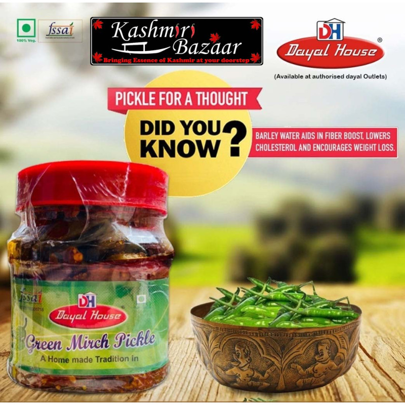 Ingredients:- It Contains Green Mirch, Mustard oil, Edible common salt, Red Chilli Powder, Haldi Powder, Vinegar, lemon juice, Mixed Spices, Condiments & class II preservative (INS-211)